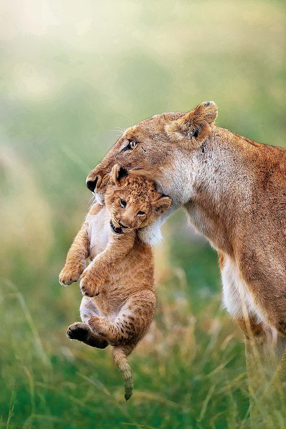 A lioness in Kenya's Masai Mara National Reserve carefully picks up her little cub by its scruff