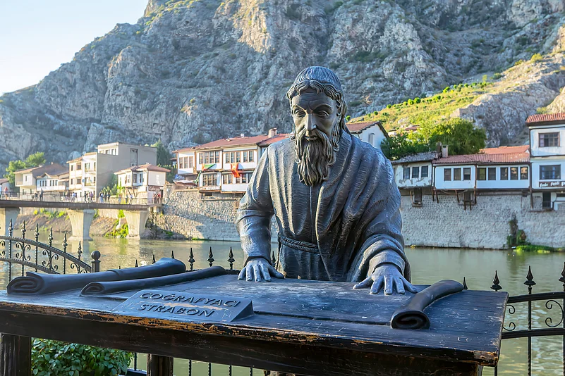 Strabo, in his monumental work "Geographica," deemed Geography a pursuit fitting for philosophers. This 17-volume masterpiece encompasses both the physical and political portrayal of the Roman world. An avid traveller, Strabo's passages traverse the landscapes of Turkey, Italy, Ethiopia, Armenia, Egypt, and Greece. His writings mirror his own odysseys and pay homage to figures like Homer, who he hails as the geography forebearer, Eratosthenes, the first to coin the term and calculate Earth's circumference, and Hipparchos, the Greek astronomer-mathematician. Strabo's cartographic masterpiece, influenced by Eratosthenes' earlier creation, presents landmasses amidst the world's expanse of ocean. This depiction teems with possibilities, portraying Northern Europe, the Mediterranean, Asia, Libya, Arabia, and India, inviting exploration.