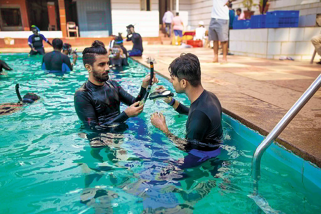 We were told wed be entering the sea by tumbling backwards from the boat. That didnt sound very appealing, and for a moment my resolve wavered. But I forced my adventurous side to take the upper hand as I gazed at the little island. Until a decade ago, the Indian navy used Netrani for target practice. But the Karnataka High Court put a stop to this following protests by environmentalists. This biodiversity-rich area has some of the rarest species of underwater life, which abound in the coral reefs that were discovered only 12 years ago. Given the growing popularity of undersea sports in general and Netranis dive sites in particular, the island was swarming with people who had come from all over the country for the festival, waiting to try their hand at scuba diving or snorkelling.