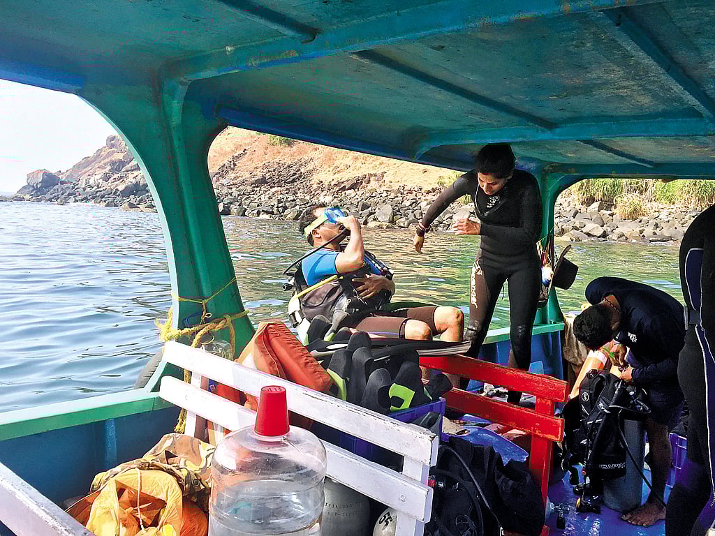 Our base was the quiet beach and temple town of Murudeshwar, about three hours from Mangalore. We were expected at the dive centre by 7.30 am, which meant an early start. Deprived of my regular dose of caffeine, I signed the health form groggily. A one-hour ferry ride took us to the island. We were a mixed group of new and certified divers. I was, fortunately, among the formerI say fortunate because Id heard that ones first undersea experience can be life changing, and I wanted to find out if that was true.