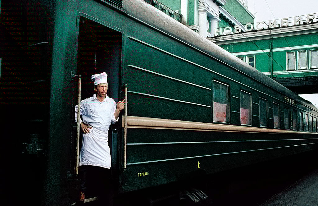 A cook takes a break at a station onboard the Trans-Siberian Rail[/caption]
