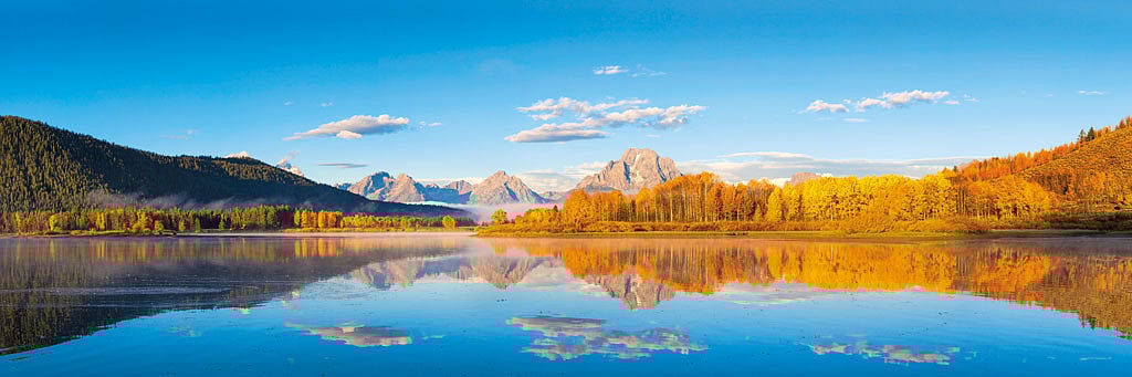 Early next morning I pointed the nose of my Jeep north and headed through Grand Teton towards Yellowstone National Park. But I just had to stop 40 minutes later at the Oxbow Bend. This is where the fast-flowing Snake River slows down and, hence, lots of animals gather to forage and drink. It was a beautiful day with deep-blue skies and snow-capped peaks reflecting in the still river. Two men paddling across in a canoe were the only indication that this was real and not a huge painting.