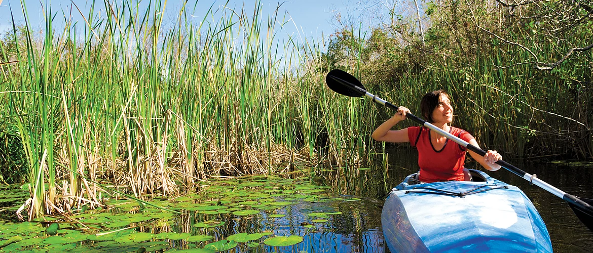Sea kayaking can be done on a tranquil bay in Cocoa Beachs Thousand Islands through Wildlife Watersports. They have a wide selection of one- and two-man kayaks and paddleboards to choose from. Private changing stations, lockers and a basic level of instruction for beginners are provided. See wildlifewatersports.com.