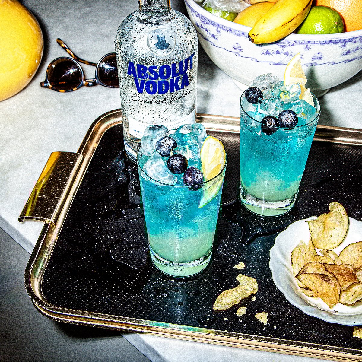 Fill a highball glass with ice cubes. Add the mentioned amount of Absolut Vodka, lime juice and simple syrup. Garnish with blueberries and a lemon wedge and stir. Add blue curacao.