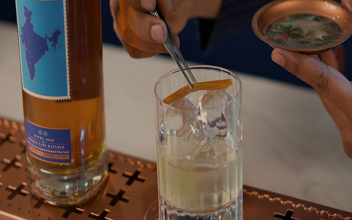 Add all ingredients to a cocktail shaker (except milk), add ice, and shake well. Strain and add milk. Allow this to settle. Filter through a coffee filter. Serve in an Old-Fashioned glass with an ice block. Garnish with Aam papad.
