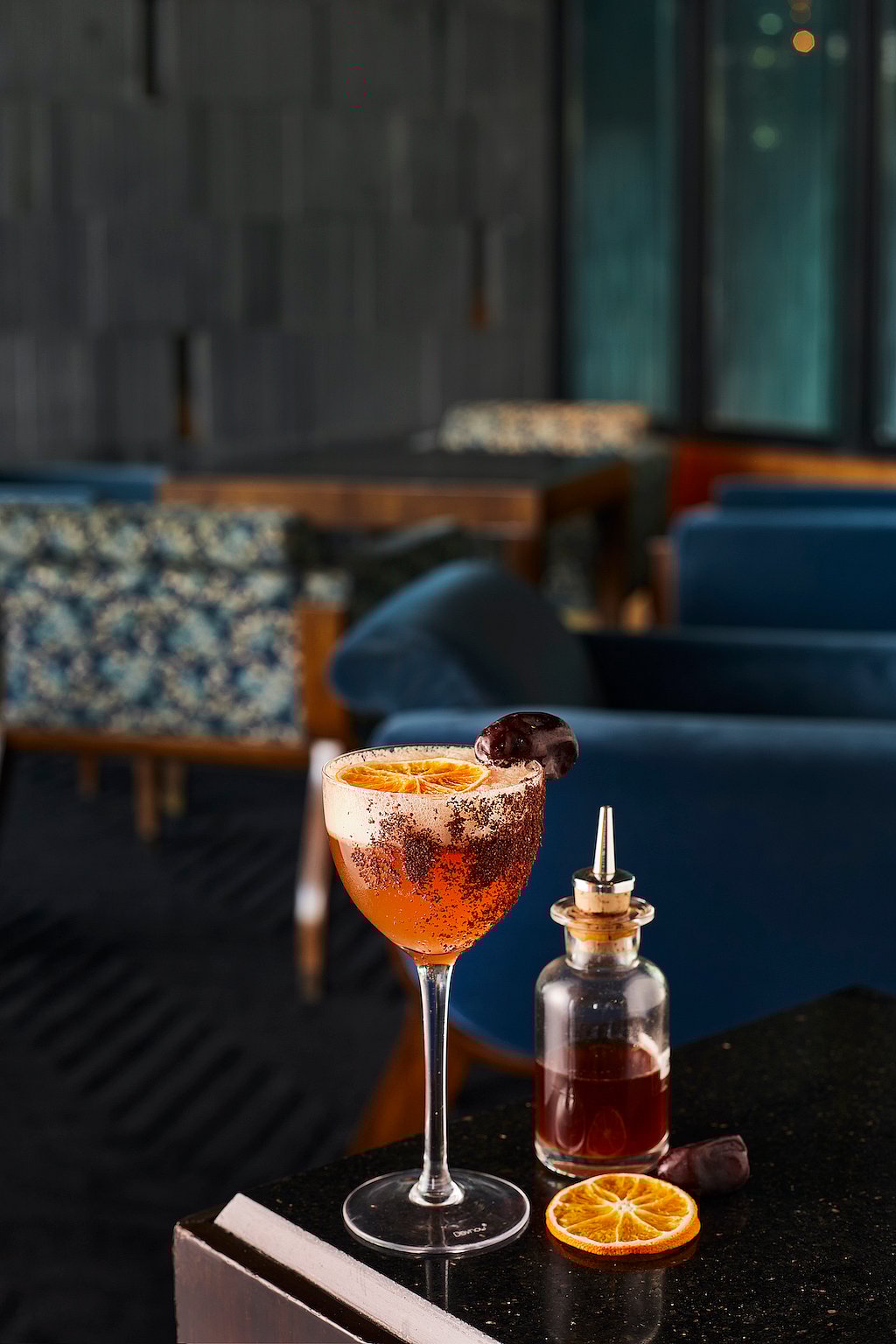 In a cocktail shaker, add ice and all the ingredients, shake well. Strain and serve chilled in a goblet garnished with a dehydrated orange slice, and a date on the side.