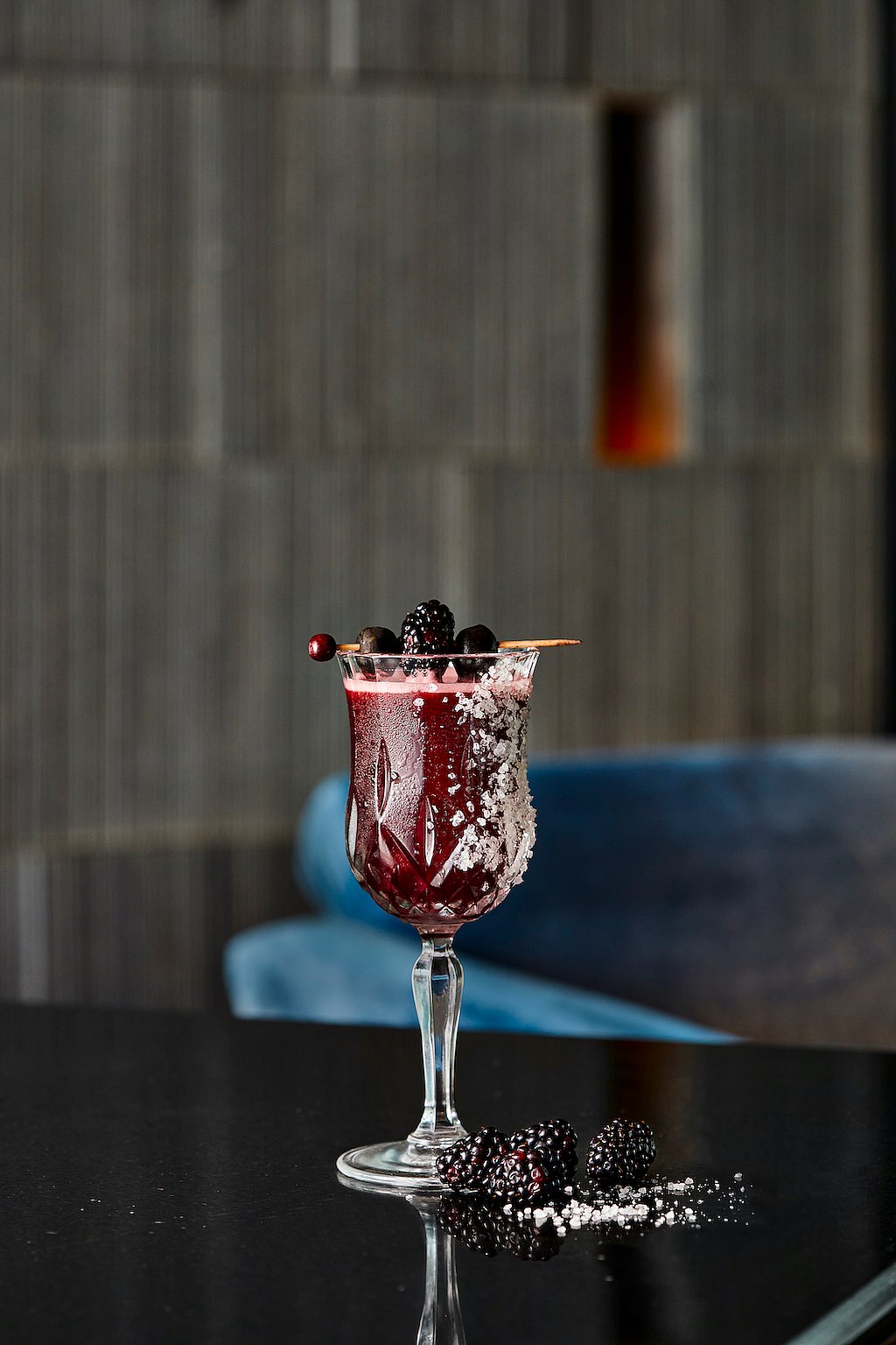 In a cocktail shaker, add the red wine, aloe vera syrup, blackberry puree and angostura bitters and shake well. Rim a crystal goblet with sea salt and an orange twist. Strain and pour over the cocktail. Garnish with blackberries and serve.