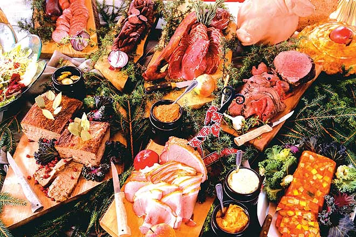 It&rsquos customary to begin with sill(herring), prepared in many ways fried and pickled in vinegar and chopped onion, or marinated in mustard, or with red onion and sour cream. This is usually followed by other seafood jellied eel, smoked fish, and raw picked salmon. A particular favourite is the gravad lax salmon marinated in sugar, salt and dill, and served with a cold sweet-and-sour mustard sauce. Diners then proceed to the cold dishes baked ham or liver paste, accompanied by vegetable salads. Hot dishes, often Swedish meatballs, are next in line, backed up by cheese and crackers, and perhaps a fruit salad.