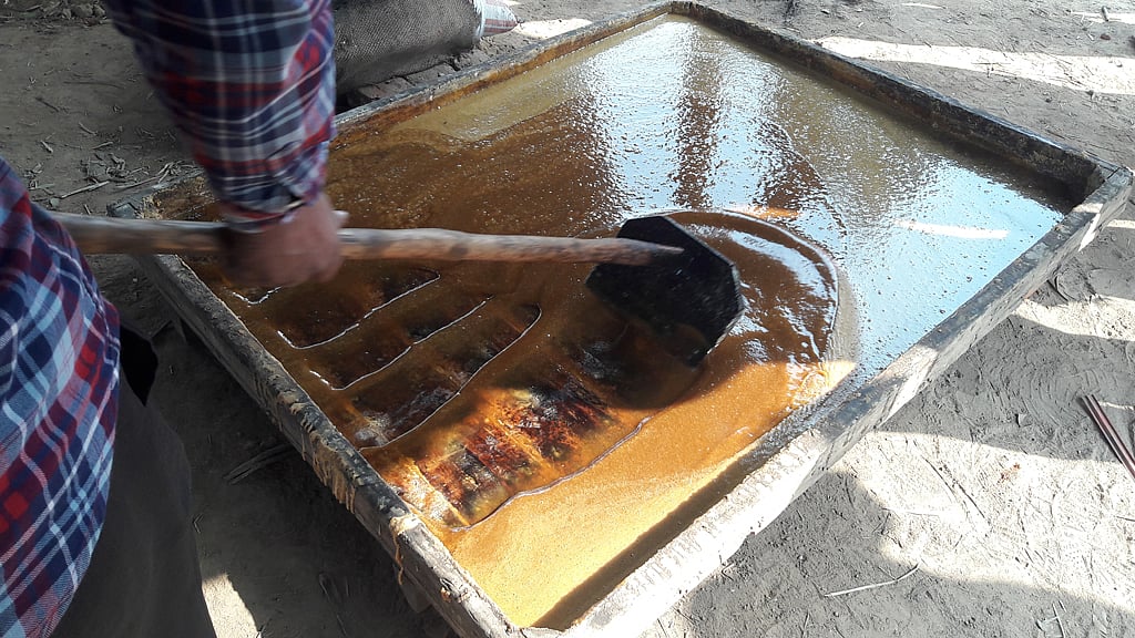 A typical scene of a vast ganne ki khet (sugarcane field), a huge pile of ganna (sugarcane) on a tractor, right next to it stood a machine that pressed the juice out of those canes...in Bollywood movies one would expect a love story budding, one cane at a time. But I stood next to a roaring firepit and someone stirring tirelessly a huge vat of boiling sugarcane juice. Right after the juice was reduced to a desired consistency, it was transferred to a large pan for cooling. There it was, right in front of me, fresh organic gur. While tasting it scalded my finger, it was completely worth it.