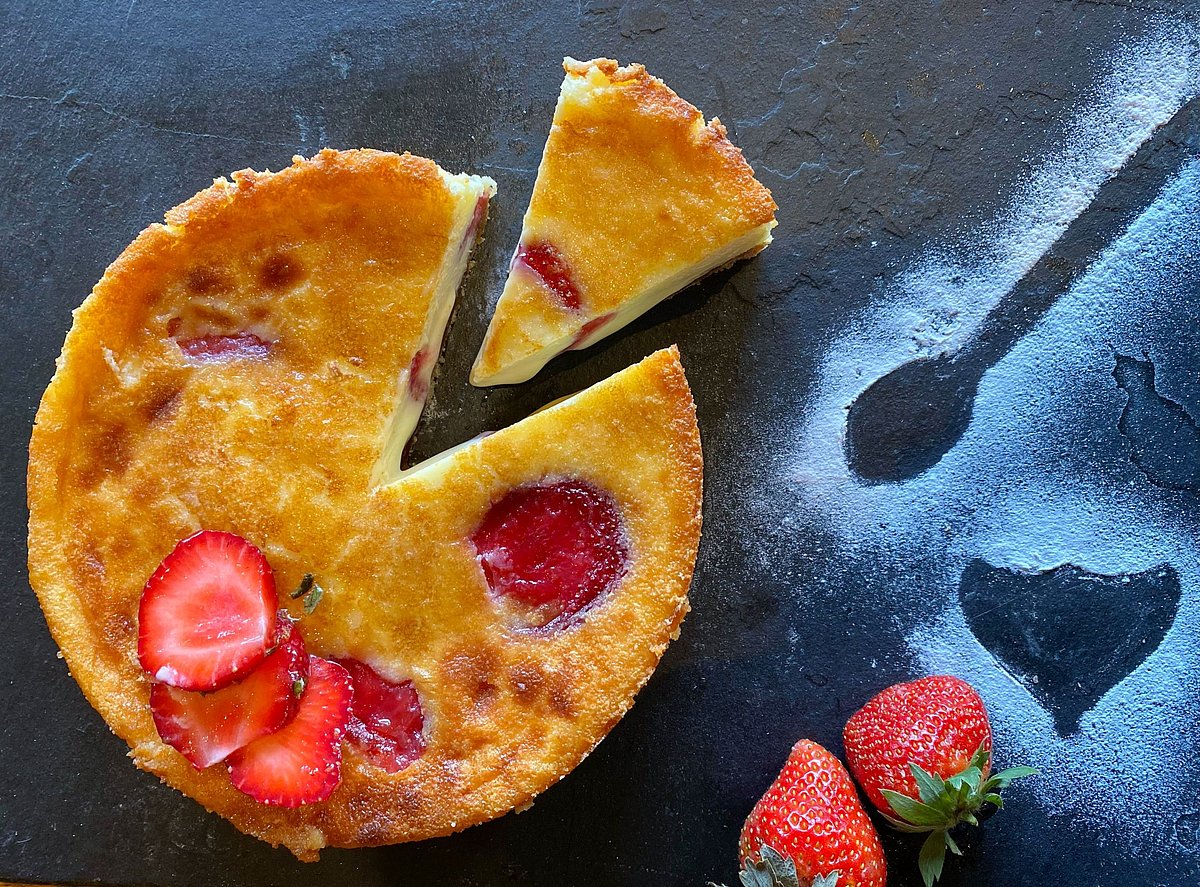 Soak the moong dal for 1 hour. After it&rsquos softened, grind it to make a paste. In a pan, heat ghee & add the paste to it to sauté. Once sautéed, keep it aside until it comes back to room temperature. In a separate pan, mix castor sugar in cream cheese. Add the eggs one at a time & keep mixing to maintain a smooth consistency. Continuing the mix, add milk, fresh cream and orange zest. To the well-mixed batter, add the vanilla essence and sliced strawberries. Fold the batter to mix the vanilla essence & to ensure the strawberries don&rsquot crush.