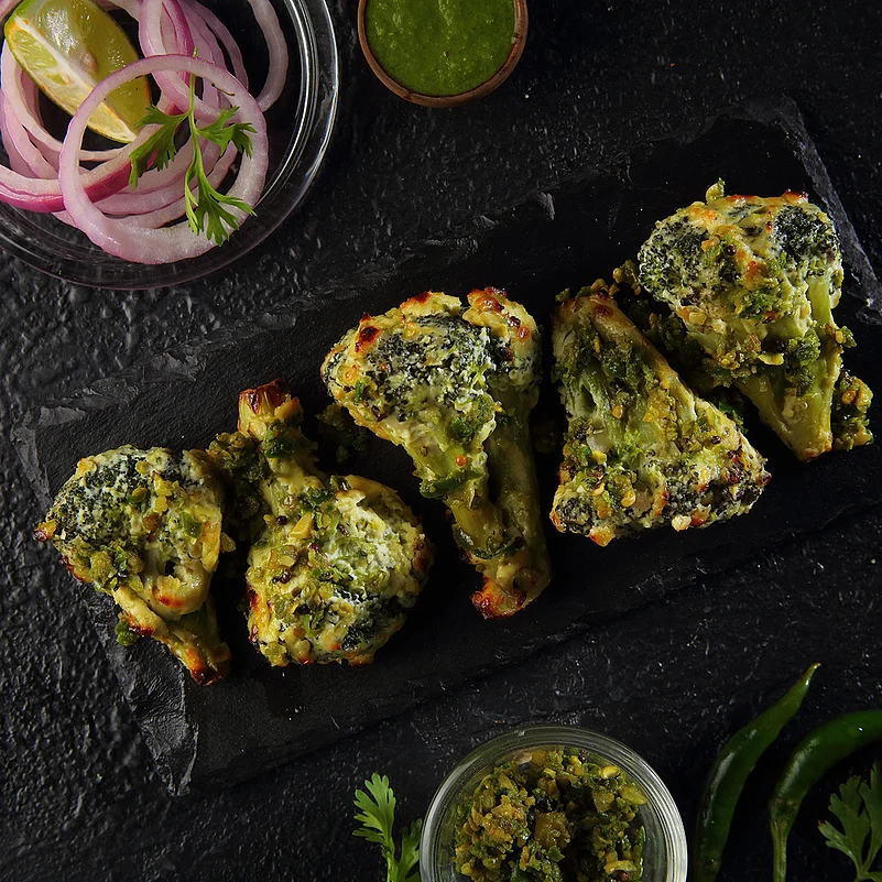 In a flat plate, mix the following thoroughly Curd, ginger garlic paste, thecha, salt, cumin, garam masala. Marinate the broccoli with the above mixture and leave in fridge for half an hour. Remove the broccoli from the fridge and cook in oven/ tandoor for 5 to 10 mins, depending on temperature. Once cooked remove and baste with butter and serve hot with green chutney.