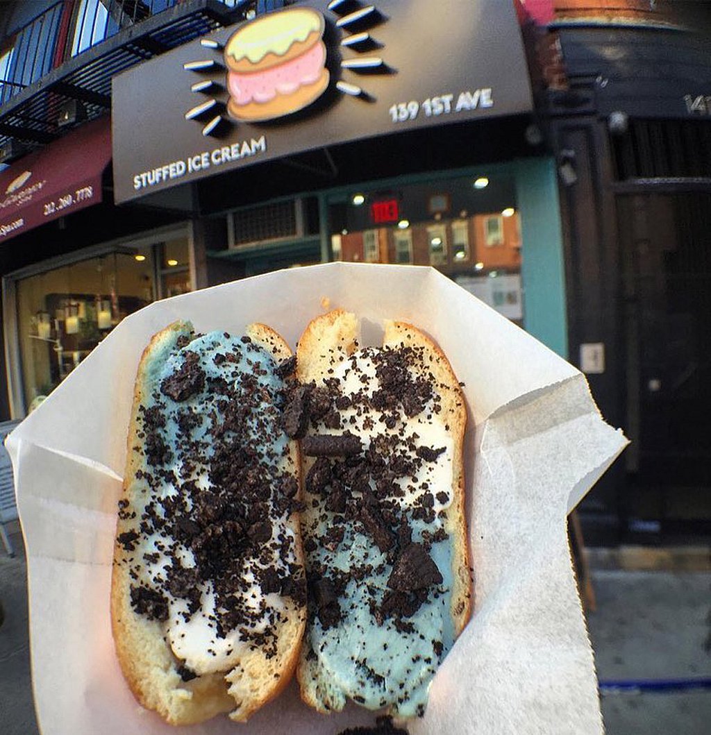 This got the warm and cold together. Warm glazed doughnuts stuffed with cold ice-cream and toppings of your choice&mdashfrom gummy bears to coconut&mdashhere&rsquos a new way to eat your ice-cream. Grab one of these at the Stuffed Ice Cream in 139 1st Ave, East Village, Manhattan.