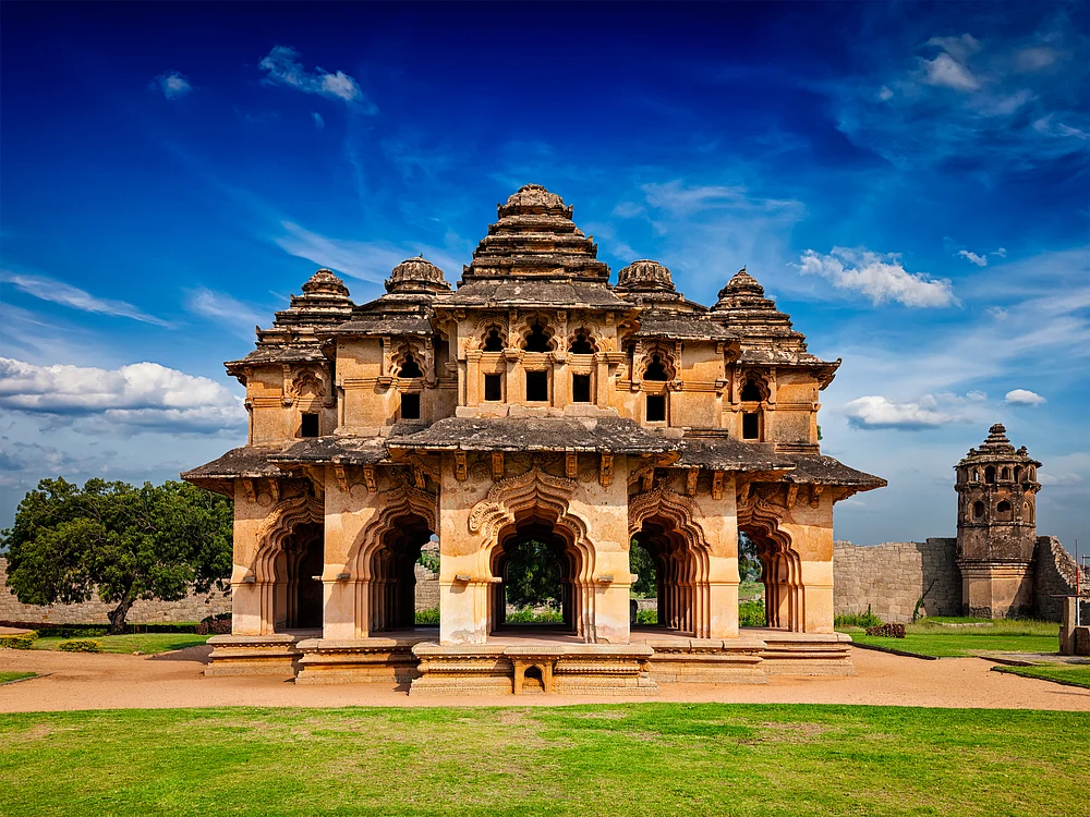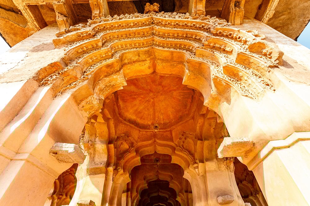 The architectural design of the Lotus Mahal sets it apart from other prominent structures in Hampi. Its structure illustrates the Vijayanagara courtly style, skillfully blending temple-like elements such as curved eaves and pyramidal towers with sultanate influences seen in lobed arches and plaster designs.