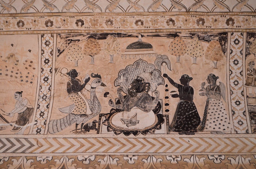 But the chef-d&rsquooeuvre of the temple are the paintings on its ceilings. From scenes inspired by the Ramayana and Shrimadbhagwat Gita to the Sepoy Mutiny of 1857, they are absolute masterpieces.
