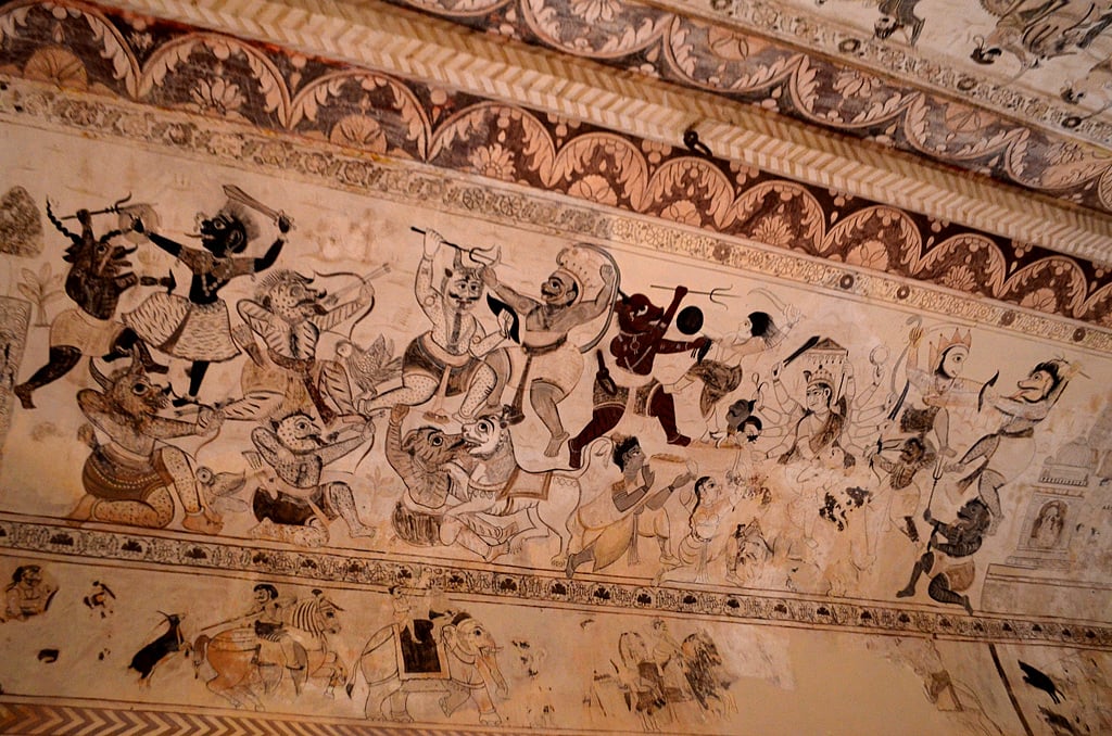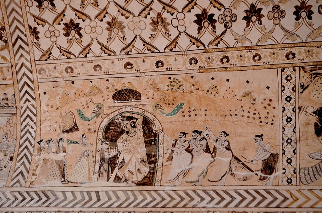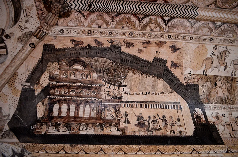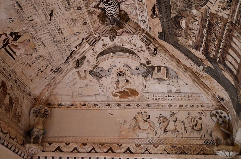 Constructed by Bundela chieftain Raja Bir Singh Deo in 1662 AD, the temple is dedicated to the goddess of wealth, Lakshmi. Raja Prithvi Singh added to the building in 1743 AD. While most temples in India are known for the idols that sit in their sanctum sanctorum or their elaborate facades or towering entrance gates, Orchha's Laxmi Temple—mistakenly called Lakshminarayan Temple by most people—is known for its wealth of these gorgeous and tastefully done paintings. And rightly so.