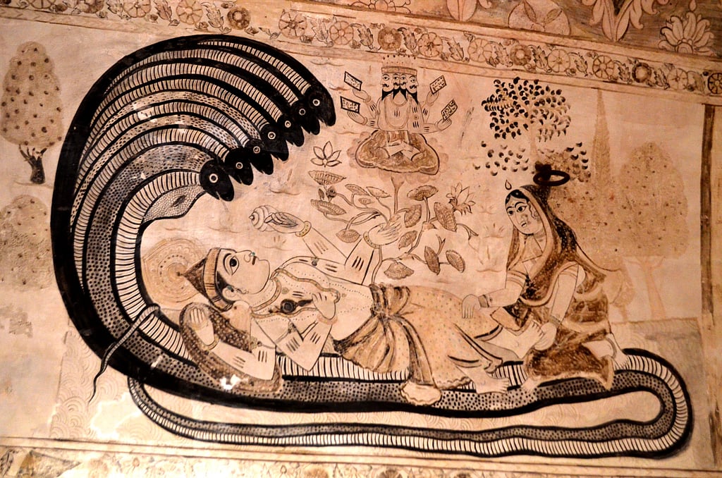 Then there are paintings of the Bundela kings who can be seen with their armies in the battlefield. And scenes from Lord Krishna's colourful life, where he is surrounded by gopis. Some paintings depict British officials enjoying a drink with Indian kings, traders selling goods to customers, women making food on traditional hearths, and other such scenes from daily life. Another painting that will definitely catch your attention is the one that features Lord Vishnu resting on Sheshanaga.