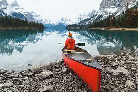 Accessible only by water, Spirit Island can be reached through guided boat cruises or by canoe and kayak for those seeking a more immersive journey. As you draw closer, the island reveals itself gradually — a tiny grove of spruce trees framed by mountains that seem to bow around it.
