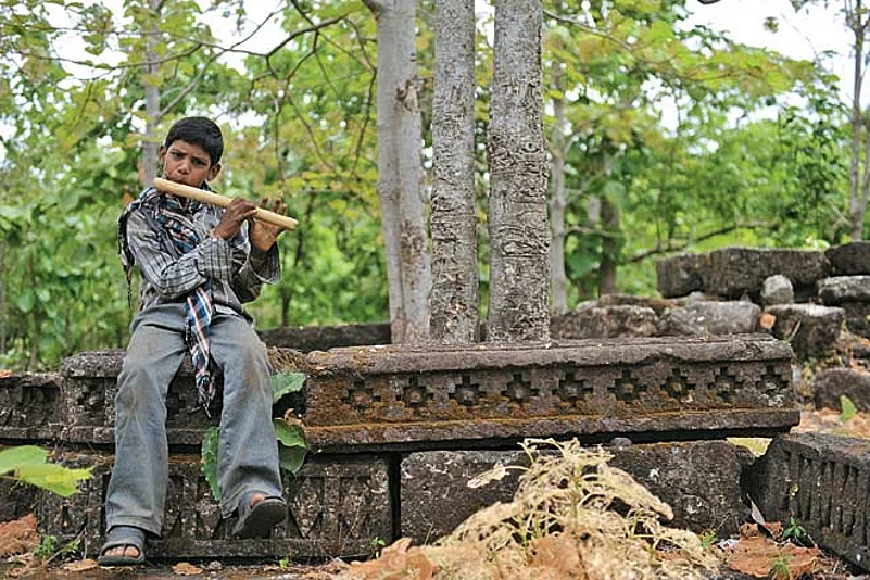 Presently, we came to the heart of the ruined city a high mound, crowned with the ruined plinth and walls of two temples or palaces, surrounded by some of the most artistic rubble I've ever seen. Exquisitely carved blocks, fine pillars, a statue of Bhairava, architectural jambs and friezes of standing deities lay around, overrun by high grass, creepers and tall trees. Just like present-day Mandu, ancient Mandapika too must have suffered from water shortages, and just like Mandu, it too depended on deep wells and lakes for its water, for just beside the mound was a huge well, and two boys were gambolling in its depths. One of them, Ranjit, would take some time out to play a haunting tune on a rough-hewn flute. Later I saw that many of the herders had similar flutes that they would play on while walking. The plaintive music added a whole other level of strange to the already eerie scene. A large, dried-up lake bed contained more ruins, with fallen old capitals and mounds that may have been temples. The only thing left standing from this forgotten city in the forest on a hill was an extensive embankment beside the lake, carved rocks set out in a perfect geometric pattern. I asked Parvez if any excavation work had ever been done here. He shook his head and said that most people didn't even know that this place existed, and that he came only about once every year, bringing mostly foreign tourists who didn't mind a bit of a hike.