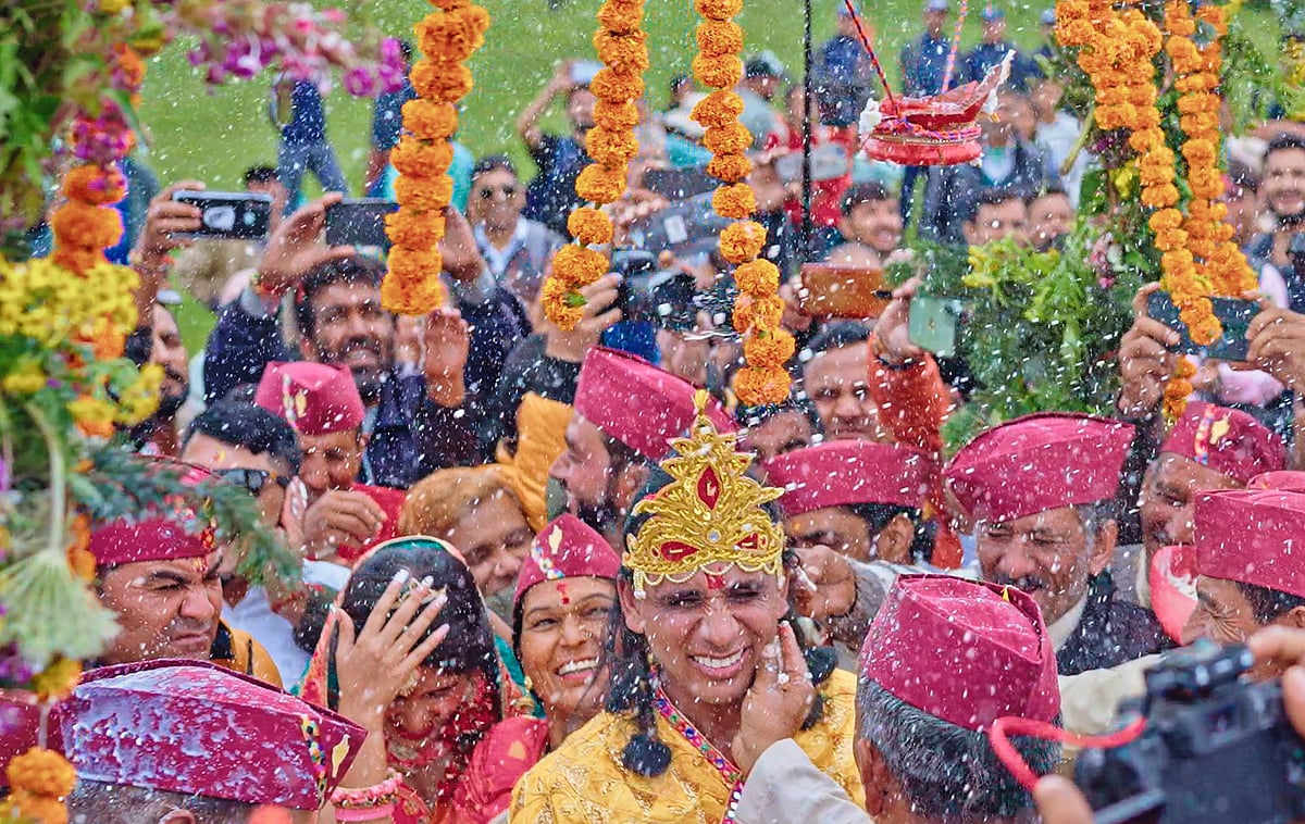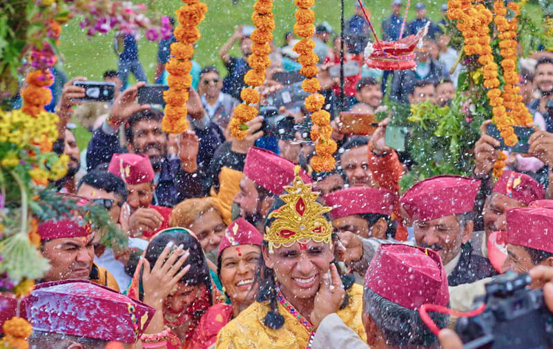 Preparations for this grand celebration extend for weeks as villagers invite their loved ones to participate. Their dwellings and barns are adorned with floral arrangements, while a tradition of adorning the doors with Pooris (deep-fried bread), is meticulously observed. While cow dung was previously used to playfully welcome guests, it has now been substituted with butter and buttermilk, ensuring a more enjoyable experience. Additional elements have been seamlessly integrated to enhance its visual allure in response to the festival's burgeoning popularity among tourists.