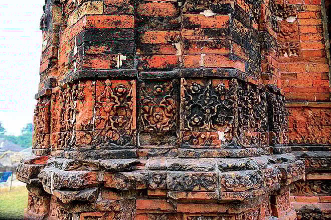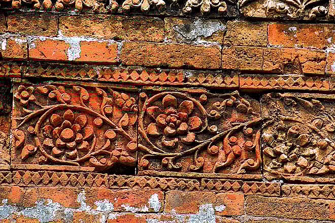 Brickwork was used for building major portions of the temple, but lesser terracotta decorations were in existence back then as well. In the chapter Sultanate Mosques in Bengal Architecture in Muqarnas, An Annual on Islamic Art and Architecture, Professor Perween Hasan from the University of Dhaka suggests that the pre-Muslim period temples in the region were in stone or brick in the Orissan nagara or rekha style that has little place for plaque ornamentation, though it does use ornamental brickwork. She also draws attention to the fact that stone sculptors, who had the honour of making the deities, enjoyed a status higher than that of the terracotta maker whose work belonged to the folk tradition.