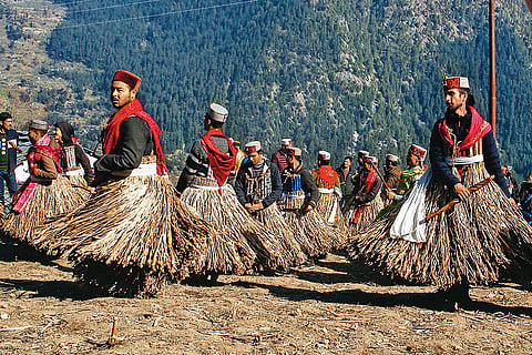Faguli, one of India's most unusual spring festivals, is supposed to ward off evil spirits. This is an important festival in the Himachal Pradesh's mountain village of Tirthan Valley, and is named after "falgun," the twelfth month of the Indian calendar. During the festival, people wear masks and skirts made of sharuli grass collected from nearby forests. The grass is washed and dried, and then woven into a chola (a long, thick skirt) by artisans from the neighbouring village of Chehni. This particular weaving ability is passed down over generations.
