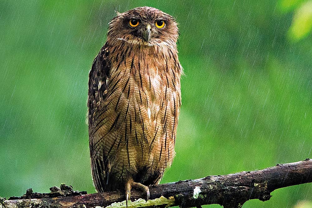 “As summers wane and the rain makes the jungle lively again, bringing dried streams, puddles and ponds to life, the brown fish owls become active.”