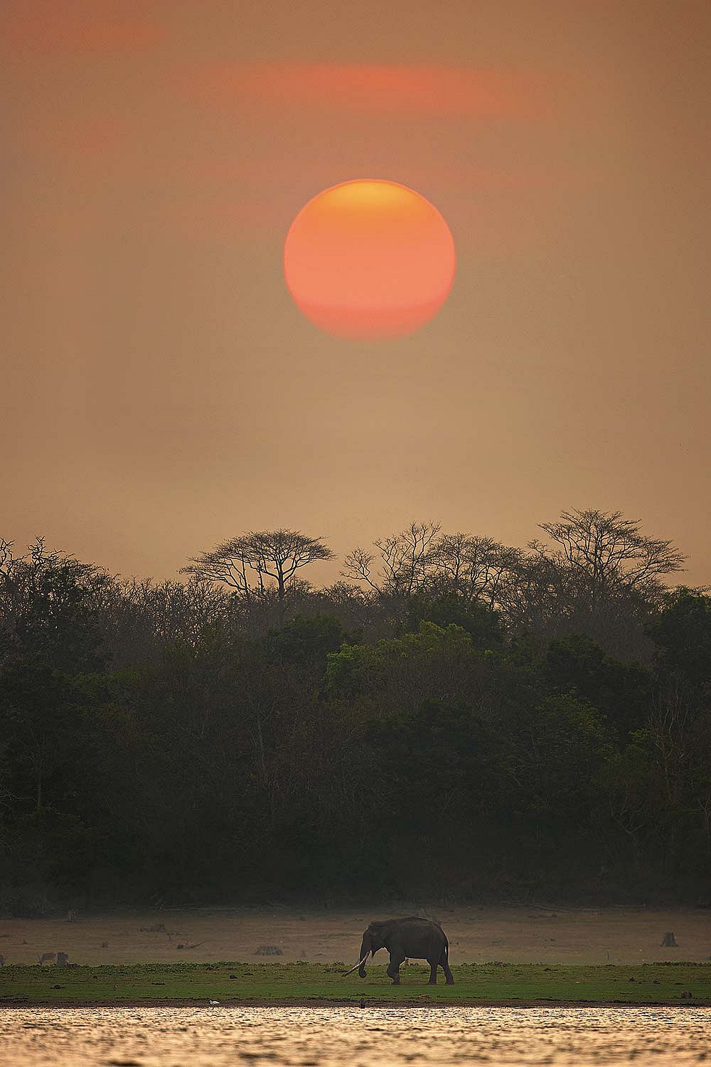 “An elephant peacefully grazes the banks of the Kabini River against the setting sun.”