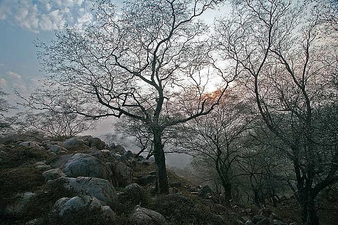 In the middle of this nowhere, Pradip Krishen, author of Trees of Delhi who I am accompanying, stops the car. We walk for about ten minutes, winding our way past rocks hugged by stunted plants, between trees twisted by hot dry winds. It is eight o&rsquoclock on a morning in late March and it already feels like summer. And then, suddenly, we arrive at the lip of a cliff. The ground drops away and so does my jaw. Spread out below us is a deep wooded valley, densely yet delicately green, the expanse of its tree canopy broken only by the whitewashed domed tower of a small shrine in the distance. Besides the shrine, the only other sign of human presence is a boundary pillar on the far end of the valley. That&rsquos it the rest is undisturbed forest. The only sound is the plaintive call of peafowl, the only movement their ponderous glide from one tree to another. Oh, there&rsquos also the racket of parakeets arrowing across the sky. Some grasses waving as the breeze catches the outcrop of rocks below our feet. Everything else is still. We could be in the middle of Sariska National Park except that we are not. We&rsquore in Delhi NCR, twenty minutes away from the wall-to-wall carpeting of tarmac-glass-concrete-stone, twenty minutes from traffic jams, crowds, noise, dust and smoke. It feels like we&rsquove landed on a different planet.