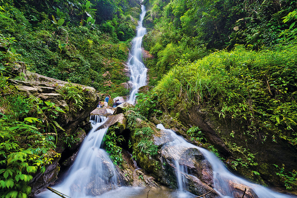 As we reach Peiling, we can see the snow-clad peaks. We stop for the mandatory chai and Maggi—a staple of travel in the Himalayas—before we continue our journey. A few kilometres later, the majestic Kanchenjunga Waterfall comes into view. Abhinav gasps, his phone now abandoned in his lap. The waterfall cascades down from a great height, its roar echoing through the valley. We stop for a while.