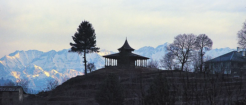 This is the highest peak in the vicinity at 11,155 ft and is home to the local mother-goddess Hattu Devi. There is a distinct shaded path with little undergrowth going up through the pine forest, which affords a steady climb. It is rare to find a place of such intense solitude with so little effort. The top is just above the tree line, here marked by black oak trees, and offers views on three sides. The land falls away dramatically, carrying forests, villages and towns on its slopes with equal aplomb. The twin temples of Hattu Devi, with idols of black stone within, stand side by side as if in a before-and-after advertisement with one shrine refurbished in white tiles.
