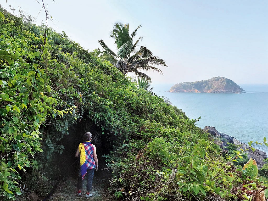 Next morning we watched glistening pods of dolphins leap and cavort in the sea. The water was a fascinating shade of grey-green with flashes of rainbows in its mysterious depths. Naturalist Roshna accompanied us on a circumnavigation of the island. We took the West Mile Way, walking through dense foliage. Here a grove called Victor Woods was dedicated to the original owner Victor Coelho.