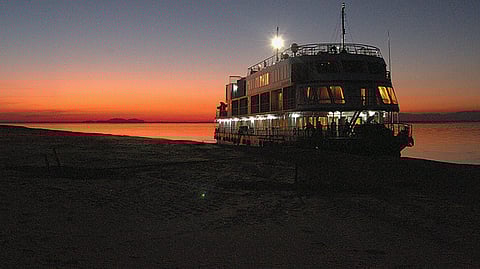 Shortly after sunset, the vehicle left the highway and turned into a dirt track. Bouncing us gently up and down for about a kilometre, it stopped at last. Shadowy figures hidden behind torchlight beams approached us. This was the welcome team from the Mahabaahu. One of the men shovelled the sand into the shape of makeshift steps, helping us down the slope. Up ahead, the ship radiated light like a horizontal Christmas tree.