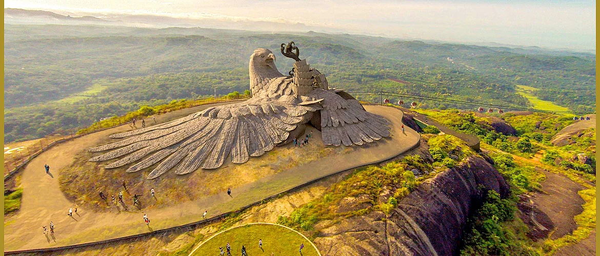 The center has been built in a public-private partnership under the Build-Operate-Transfer (BoT) model. The bird sculpture replicates the mythical bird- Jatayu, which was developed by filmmaker and sculptor Rajiv Anchal. As per mythology, Jatayu died at this spot while fighting with Raavana to save Goddess Sita. The sculpture is 200 ft. long, 150 ft. wide and 70 ft. tall, making it the world's largest bird sculpture with an entry into the Guinness Book of World Records.