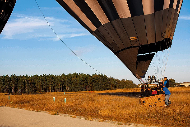 Mrityunjay and I, the only men in our group, are requisitioned to help with inflating the blue-and-yellow striped balloons. So we stand there, holding the ropes over our shoulders while the burners spit fire and the balloon swells behind us. Soon it has filled up enough to drag the wicker basket upright and we quickly clamber aboard on the captains command, four to a compartment as the balloon strains at the leash.