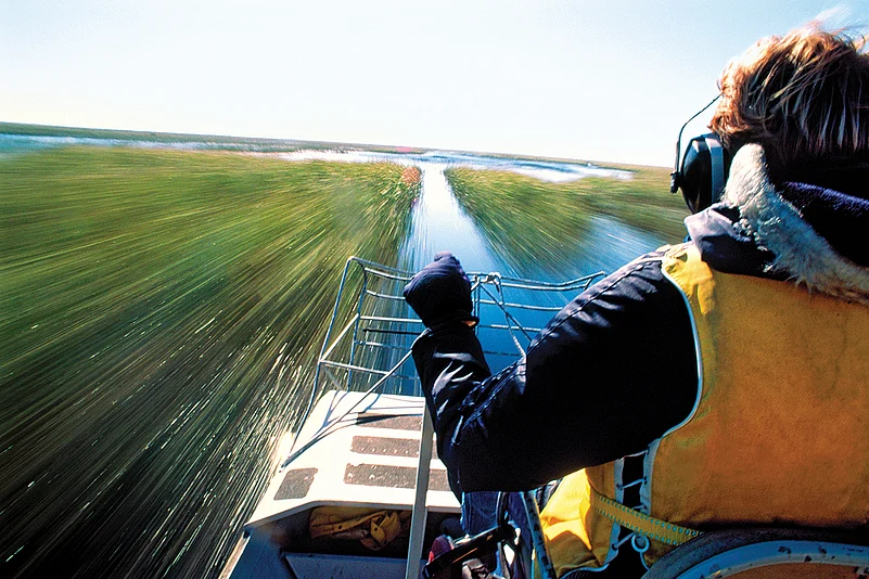 The full form of Lake Toho translates as we will gather together here, named by the Seminole Indians who used to inhabit the area. It covers about 100 sq km and spans 70 km in circumference. Trudy turns the engine off and brings the airboat to an idling halt in a side channel of the swamp. Her keen eyes have spotted some bubbles rising to the surface in a deep hole and she tells us it is a large female alligator buried in the mud at the bottom waiting for us to leave. And we do. Trudy eases up on the throttle and the airboat glides across the water in search of further prey, so to speak.