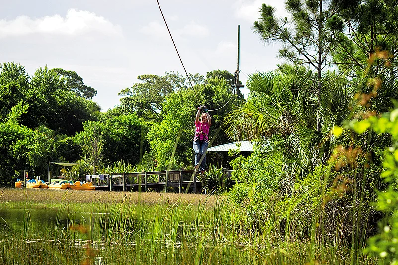 Brevard Zoo offers various levels of treetop aerial adventures. Zip lining is the most popular and you can go from the basic nine zip lines to Challenge Reloaded and the ultimate Black Diamond which throws in additional obstacles like a high-wire bicycle and a rock wall. For the less adventurous, there is the treetop canopy walk 20 feet up in the trees and two zip lines. For those with families, the zoo also has wonderful opportunities for feeding, petting and interacting with giraffes, lorikeets, rhinos and other animals. Guided kayaking trips and a train ride are also available as parts of a zoo admission package but the adventure activities have to be bought separately. Adults $17.95, children $13.95 brevardzoo.org