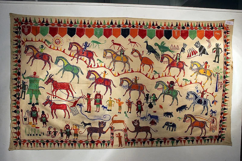 Originating from pre-historic cave paintings, the Pithora painting style, closely connected to divinity and considered a divine process, is more than thousands of years old. Practiced by the Rathwa, Bhils, and Bhilala tribes, who are part of the larger Bhil community, the hallowed Pithora art, can only be created by an artist who is able to channel the spiritual aspect of nature. These paintings are the narrators of the socio-religious history of the tribe, and nowadays also a journal of current times, which are not too fair towards the artists. The Pithora-painting tribes live in both Gujarat and Madhya Pradesh, and they begin painting only if they have a good first harvest, and that too after the festival of Diwali has passed.