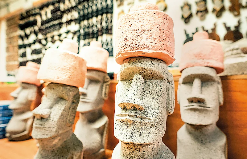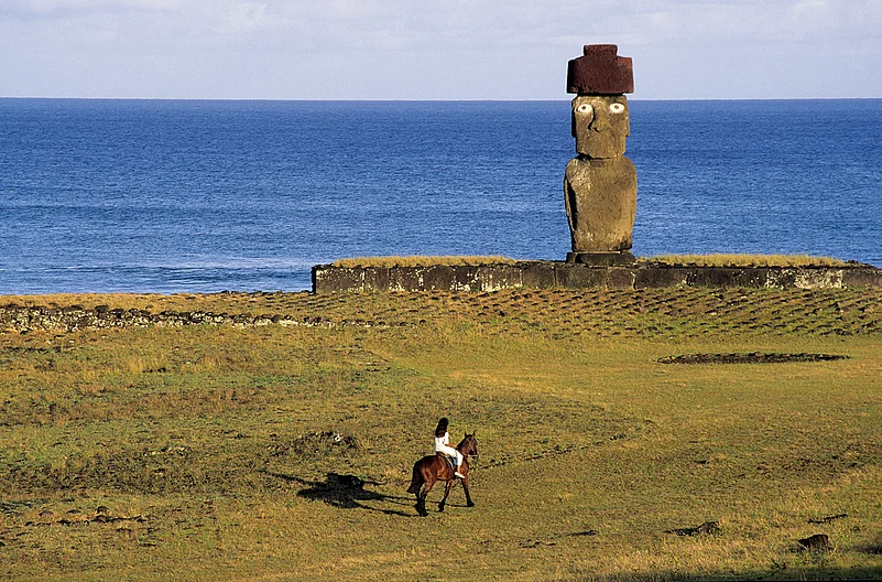 Touching down from Santiago at the main town of Hanga Roa in the morning, we were greeted by sights that were hardly extraordinary&ndashfamilies picnicking on hillocks, youngsters frolicking on the beach, dive companies soliciting tourists. It was textbook Polynesia, but with one difference. The quotidian activities of island life were being played out under the imposing aura of the moais&ndashin singles and in multiples, they loomed large all over the island.