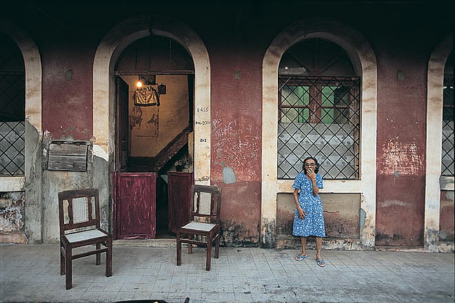 It happens imperceptibly. A window opens, then another. Curtains are gently parted and then tucked into the extremities with quick caress. A face peers out, craggy with age, or unlined and young, for a breath of the morning. A fluffy Pomeranian perches on a windowsill it will stay there for much of the day, looking peaceably at the world as it turns from monochrome into houses of blue, yellow, ochre, port, brick-red, and white that will shape-shift colour through the day and night. A suppressed cough, the smell of fresh bread, the muted rattle of a grocery opening. The universe of the narrow lane.