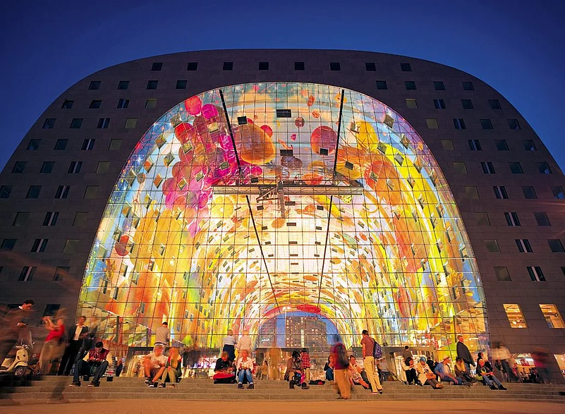 I teetered out of this eccentric housing complex and walked across a sprawling open public area to the newly constructed, horseshoe-shaped Markthal (Market Hall) Rotterdam. Only, the horseshoe was a whale-sized supermall designed for lovers of pop art. It was like walking in Alices shoes, down the rabbit hole, with a floret of graphic fruits, flowers and insects looming in a rather sinister fashion over me. Inside the mall, it was difficult to break the gaze from the floor-to-ceiling mural of the full bloom of trippy supersized art. This was until I spotted a break in this bizarre canvasa bedroom block in the middle of an apple. I squinted to find that there were many such gaps in the picture and all of them were filled up by personal homes. Markthal marks the apogee of the citys architectural eccentricity. There are 230 homes swung over the curved building, revealing Rotterdams taste for ludicrously inventive designs.
