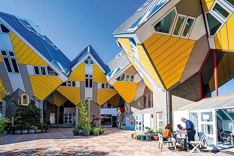 My first stop was the modern village of Cube Houses. Standing in front of the Overblaak Development, I tilted my head 45 degrees, till the ochre-coloured homes seemed straight. This 20th century hexagonal, cube-shaped set of apartments is the citys drawing card for mind-bending architecture. Propped on pylons, the style was conceived by Dutch architect Piet Blom, and disrupted the idea of space utilisation when the apartments were constructed in Rotterdam and Helmond. The homes look like a haphazard pile-up of Lego pieces but there was clear method in Bloms seeming madness the plan is based on a forest-like format that represents individual homes as trees. But one can only comprehend this when standing at a distance. Up close, with my neck swung back to take a peek inside, it looked plain disorderly. Of the 40 units, one can step inside two the Stayokay backpackers hostel and a furnished museum house, Kjik Kubus. I took a stroll into the hostel, constantly being reminded to watch my head as I walked past the common area, surveyed the dorms and the kitchen. It was a surreal experience, somewhat like walking into an alternate reality game.