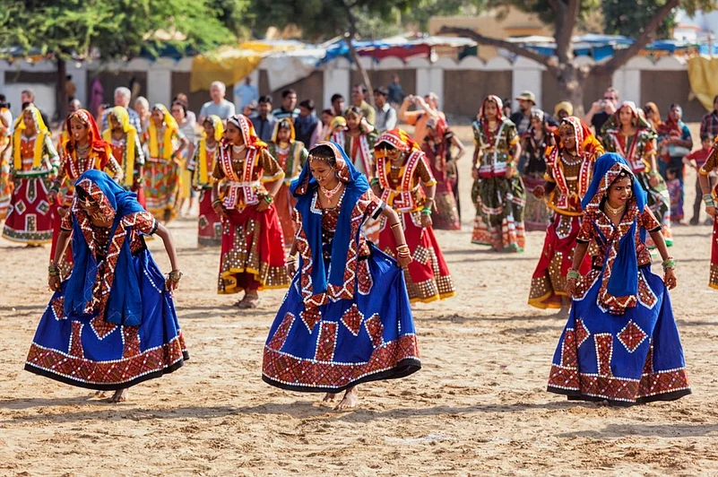 Rajasthan, being a desert, is home to camels, which are an integral part of their culture and festivals. During Pushkar Mela, camel owners dress their camels in colourful clothes and accessories, hang bells around their necks, and paint them to attract viewers.