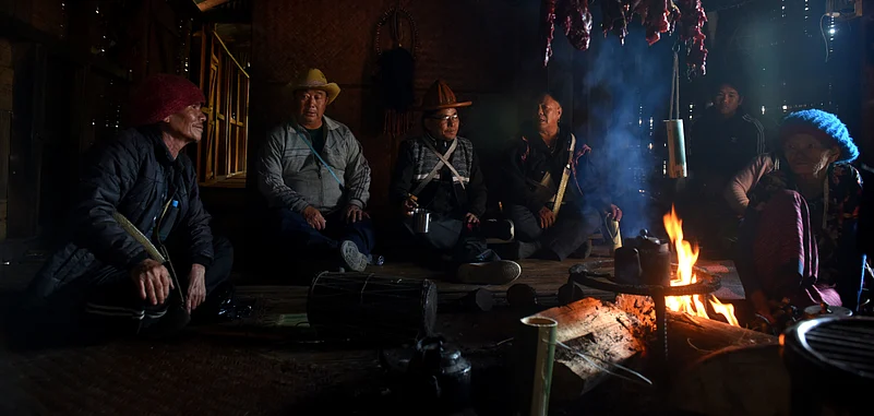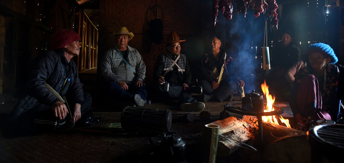 At the entrance of their house, a large platform had been raised, where Idu men adorning attractive hats were slaughtering sacrificial mithuns and pigs. In another corner, women were brewing fresh rice beer, which was being served in cool, reusable bamboo mugs. Inside their house, Gora Mimi, the head shaman sat around a fire chanting mantras, with two other shamans, for the wellbeing of the hosts and guests. Elderly women sipped their morning tea as they watched the rituals progress.