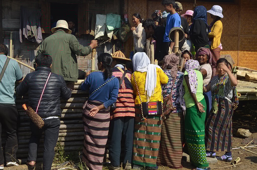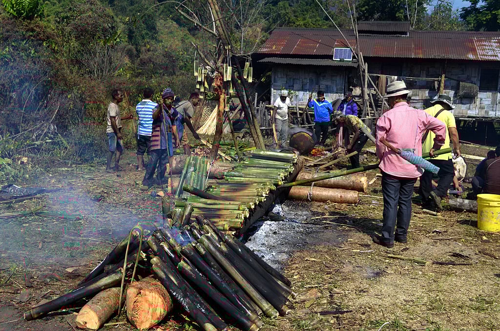 At the opposite end, super-fit men with sculpted calves and veined arms prepared a dish called shakhi puhin using bamboo pipes. They were also making a dish called shata from the meat of the slaughtered mithuns in a huge black vessel called sandifu. Every dish was being cooked on wood fire, which is why the Idu Mishmis start collecting logs of woods from the forests a month in advance.