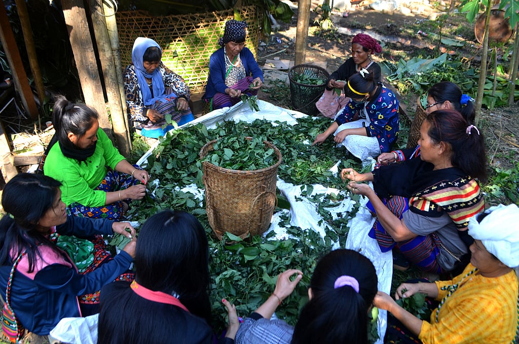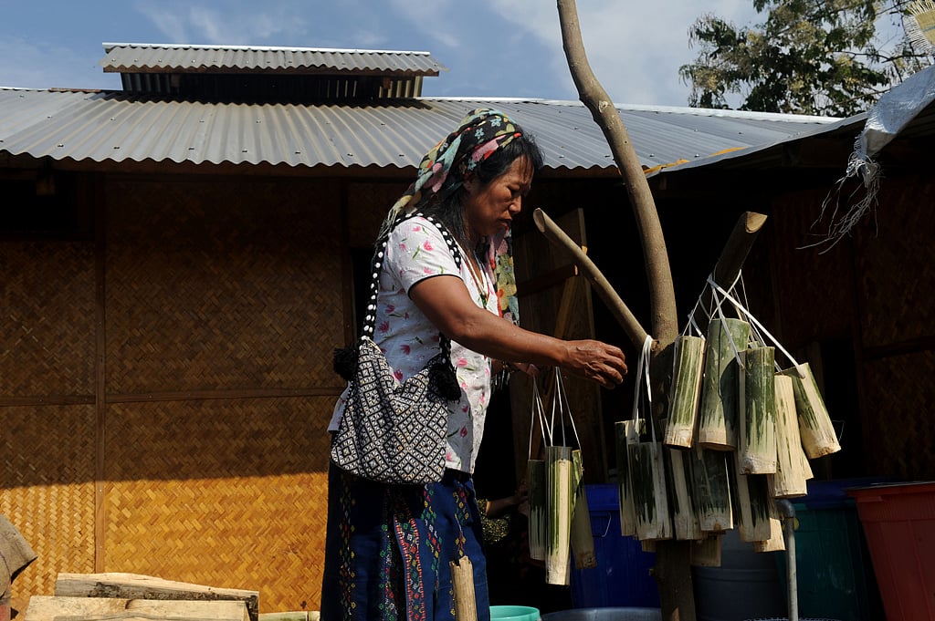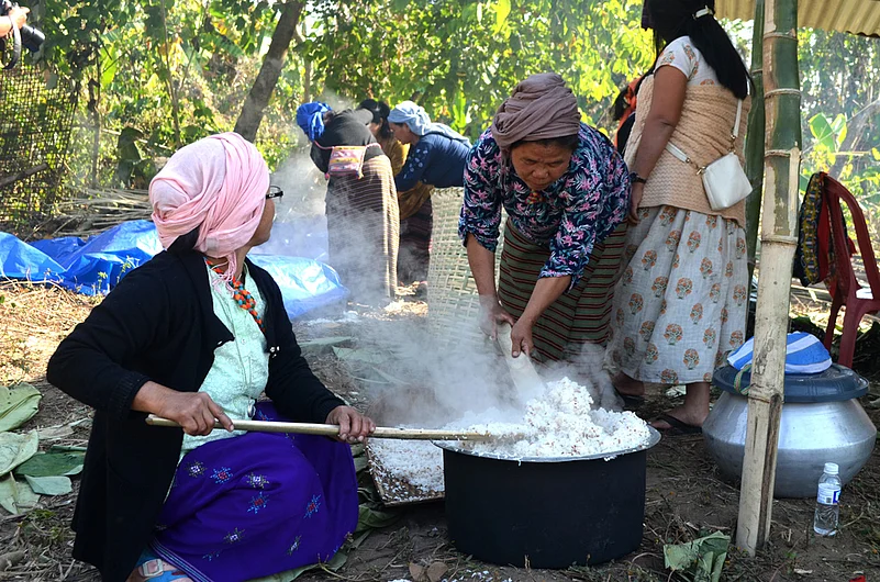 In the ground outside, a group of women sat in a circle plucking ahona leaves, which they had collected from the jungle. They would use it to prepare a fish-based dish called ahona ashumri. Another group boiled rice in large vessels called sifu to make several dishes like anunu and eka-ri. Some women were cooking a rice dish called anunu in a cane basket when another came to sprinkle bamboo shoots on it.