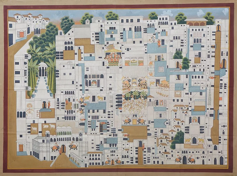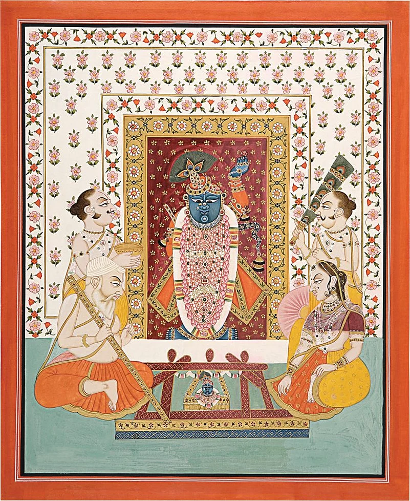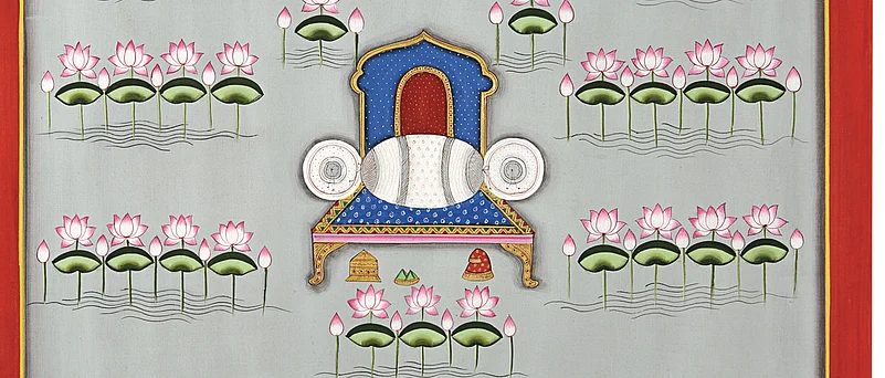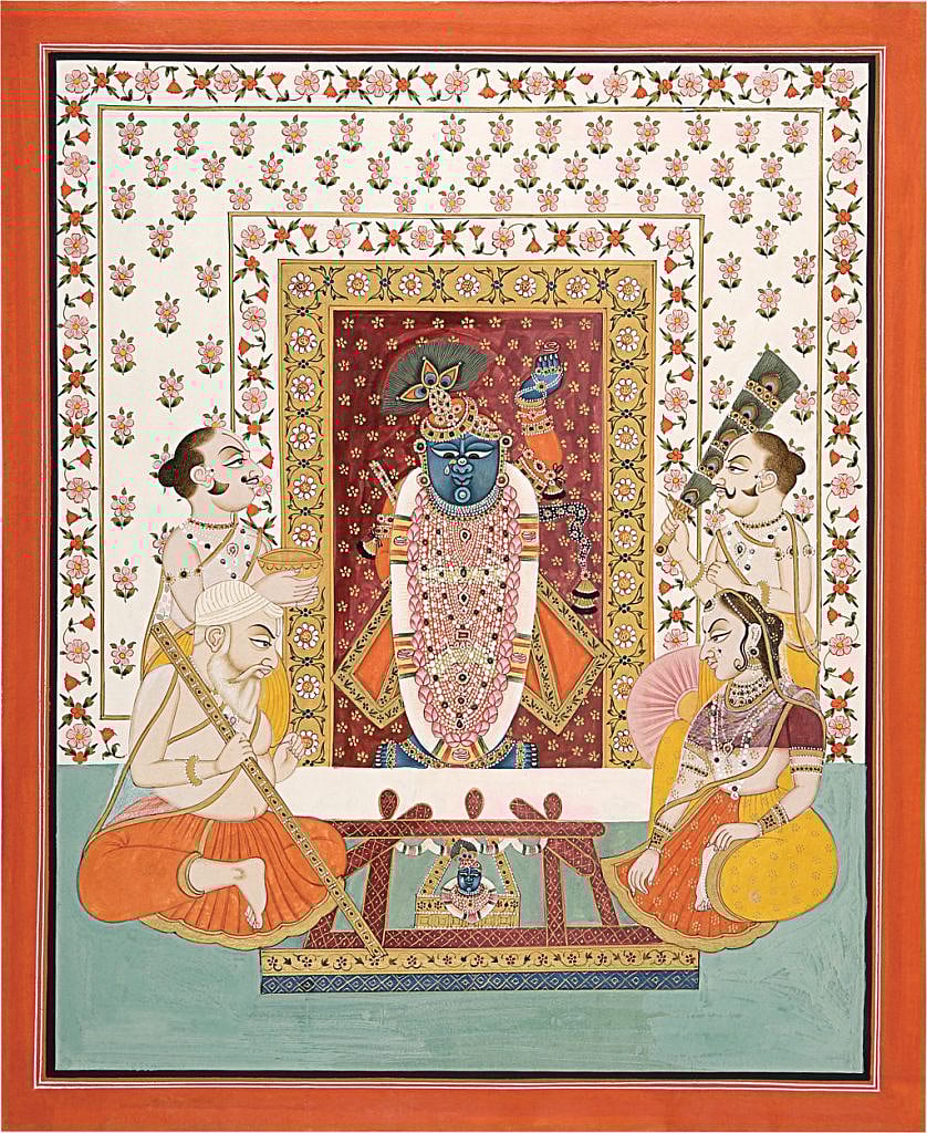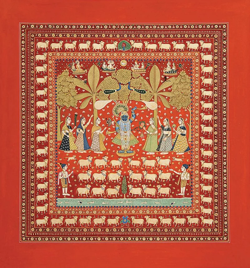 Some artists in Nathdwara near Udaipur would take large cloths, perhaps eight feet in length, and paint them with scenes depicting Shrinathji (Krishna in the form of a child). These wouldnt be ordinary depictions, but, among other things, intricately detailed and colourful scenes of the gods worship. The paintings would be hung behind the idols in the 17th century Shrinathji temple of Nathdwara. Over the centuries, these became known as pichvai (literally, something at the back).