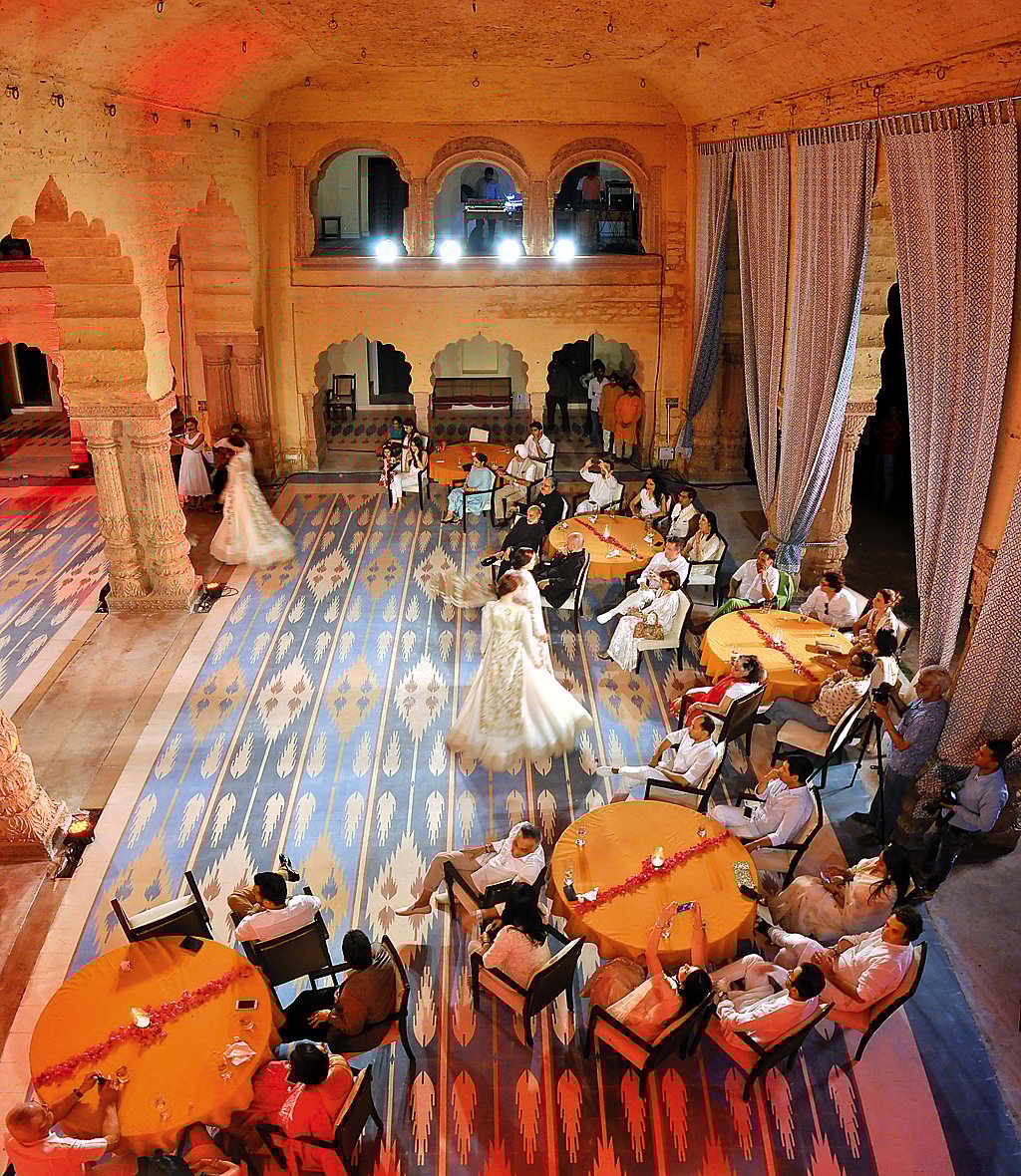 The first step in the restoration was the conversion of the mahals for modern reuse. Suite-style rooms were created, all large and suited to contemplation, and plumbing and air-conditioning was introduced. A swimming pool, a classical Indian tank in conception, was nevertheless created out of view. Below the pool, a subterranean conference room is receiving finishing touches. Glass bricks at the bottom of the pool let in shimmering beams of natural light. In another section of the fort, an auditorium with theatre-style seats salvaged from Mumbai sits above some new rooms overlooking a Japanese garden conceived by Vivek Shukla, Resident Manager and gardening enthusiast. A Jain restaurant with chowki-style seating is in the works.