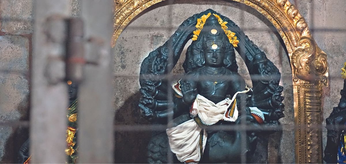 A few miles further north, another massive outcrop called Narthamalai (the hill of the Chettiyars) hides another magnificent secret. We find the hill after a few lost-in-translation-moments&mdashthe villagers speak only Tamil, and we only English and Hindi&mdashand begin our trek across its rocky surface until a temple capstone comes into view like a submarine periscope. And in a few minutes, the lost temple of Vijayalaya Choleeswaram, named after the founder of the imperial Chola dynasty, is revealed in all its sombre glory. It sits there like a compact star cruiser stranded in this strange place where it came to rest centuries ago. And the best part is that we have it all to ourselves, not another visitor in sight.