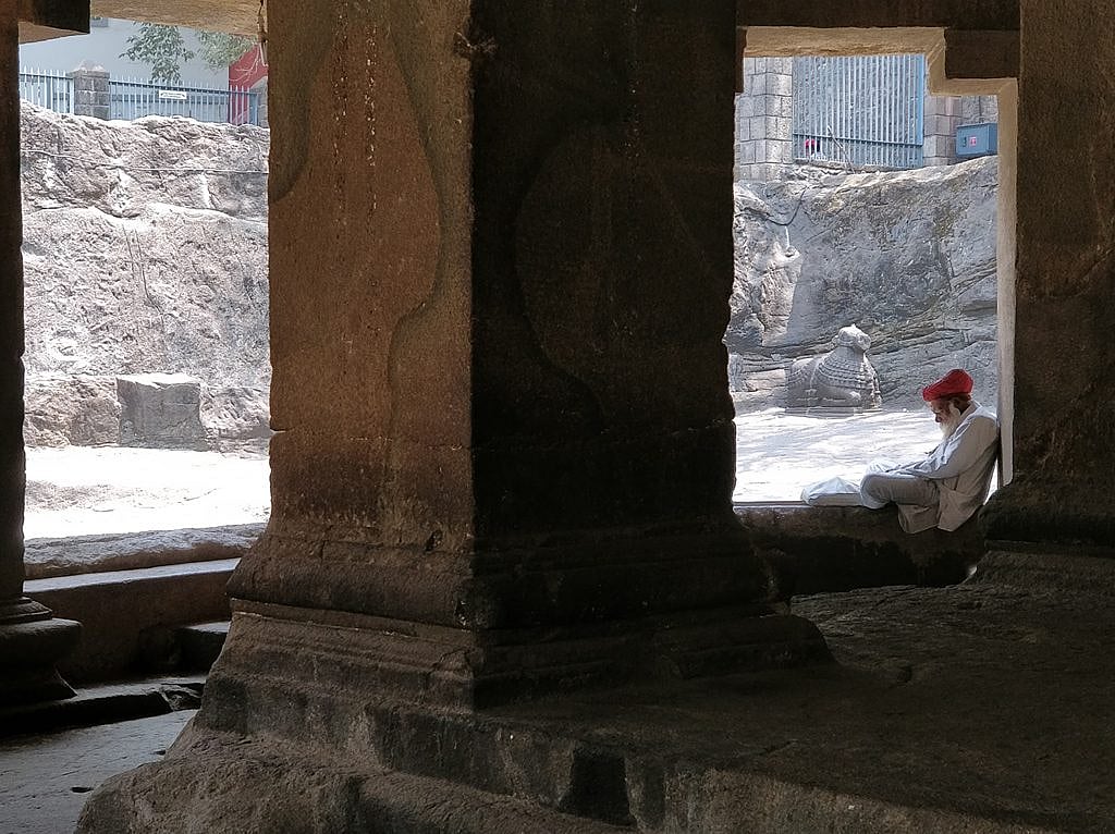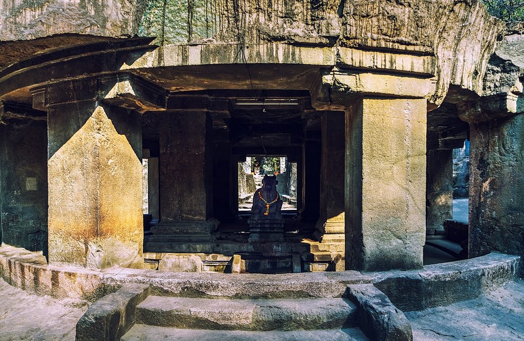 A lone man dressed in traditional dhoti and kurta, complete with saffron head gear, sat at the circular shrine right outside the temple quietly observing us. This is the Nandi mandapa, which boasts an exquisitely-carved Nandi statue, Lord Shiva&rsquos mount. There is another Nandi statue in the left hand-side corner of the complex, which most people may miss. This one looks even more stately, with the grey cave walls acting like the perfectly muted background.