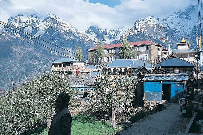 Six kilometres from Kalpa, we came to the end of the road and the village of Roghi. Breathtaking views of the massif and villages in alpine meadows surrounded by thick deodar forests made us stop every few hundred metres. The drop to the Sutlej below was so steep at one point, that one member of our group could not bring himself to stand and look over the edge. He lay down on his stomach and crept up to the edge and peered down. If you do decide to go till the end of this road, park your car before entering Roghi. Turning around later on the narrow path can be hair-raising, we discovered. The whole area around Kalpa has beautiful walks, picturesque villages and lovely people who have the time to talk to you. Apple trees are in blossom, God&rsquos in his heaven, and all seems right with the world.